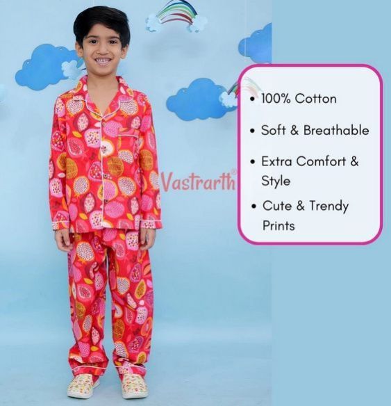 Make bedtime fun and comfortable with our Boys Cotton Night Suit featuring a playful Anar print! Crafted from 100% pure cotton, this set is designed to provide breathability, softness, and a cozy feel for a restful night’s sleep. The full-sleeve shirt and matching pajama ensure warmth and comfort, making it perfect for all seasons.