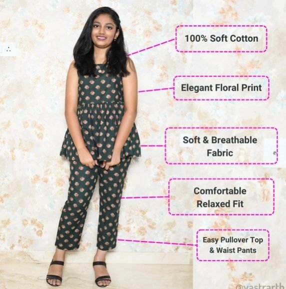 Dress your little fashionista in style with the VATRARTH Girls' Cotton Floral Print Top and Pant Set. This chic two-piece outfit features a beautifully designed floral print on a sophisticated green background. Made from soft, breathable cotton, this set ensures your child stays comfortable while looking stylish for any occasion, whether it's a casual day out or a family gathering.