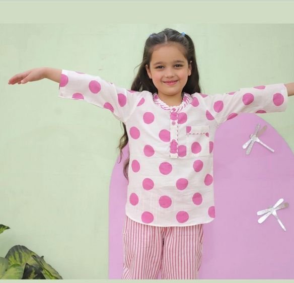 Make bedtime extra comfy and cute with this Polka Dot Purple Co-ord Night Suit for girls! Made from super-soft pure cotton, this set ensures a gentle touch on your child’s skin, keeping her relaxed all night. The adorable purple polka dot design adds a playful touch, making it a perfect blend of style and comfort.